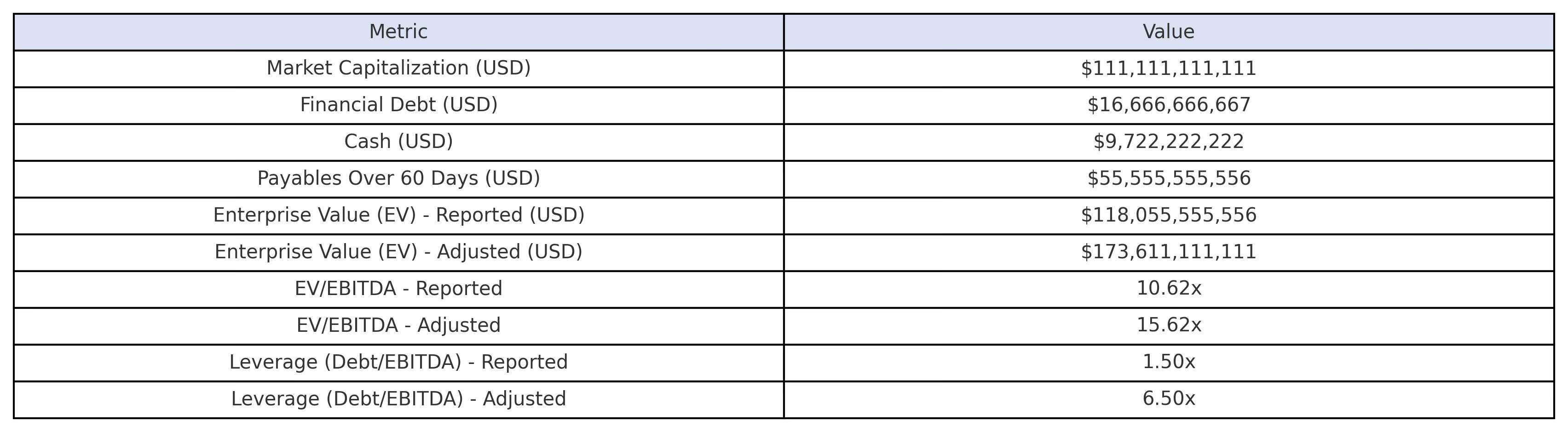 To understand the magnitude of BYD’s reliance on delayed supplier payments, we ran a scenario where the ¥400 billion in D‑chain IOUs are treated as financial debt. This adjustment significantly alters BYD’s leverage and valuation metrics, revealing a more aggressive capital structure than reported.