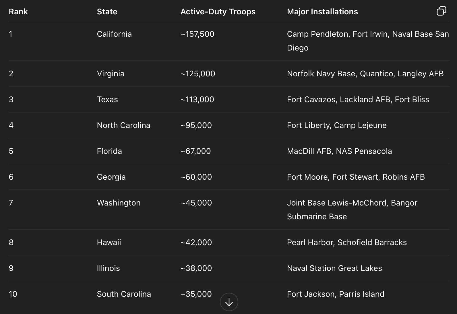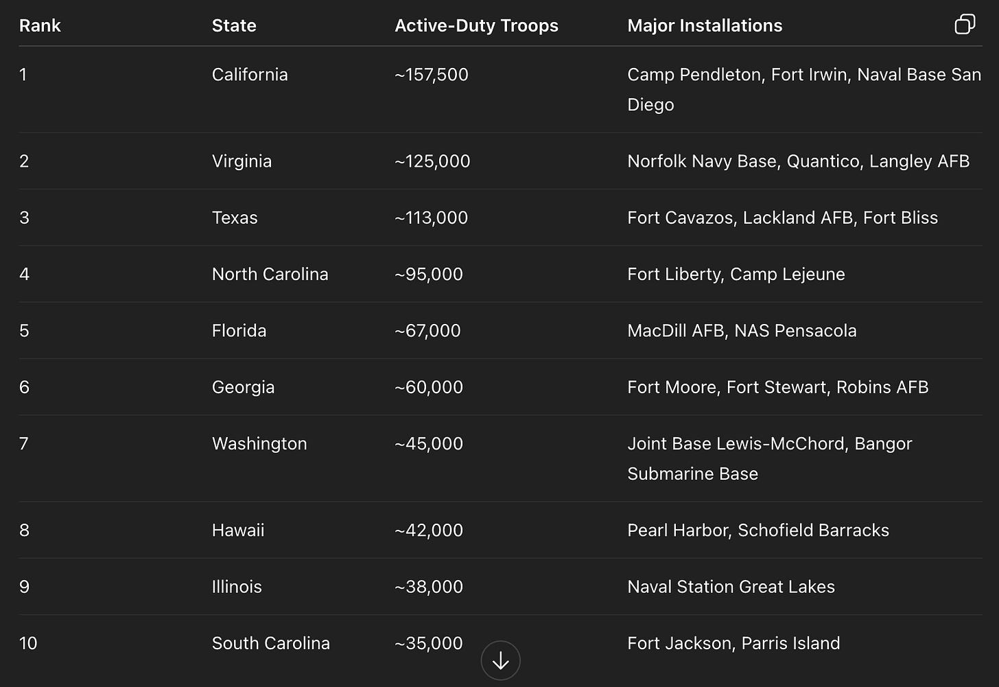 🗺️ Top 10 U.S. States by Active-Duty Troops