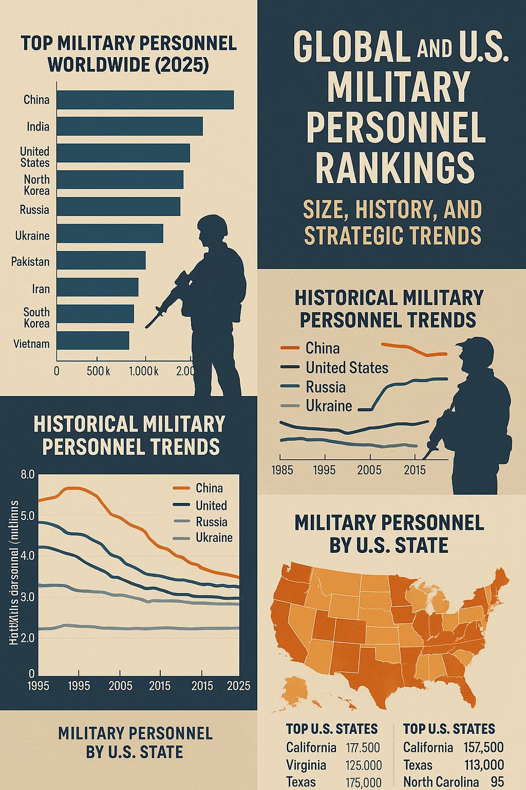 This article dives into global military rankings by active personnel (2025), explains the historical evolution of forces in top-ranking countries, and compares U.S. states by stationed active-duty troops—with trend charts to visualize past and present dynamics.