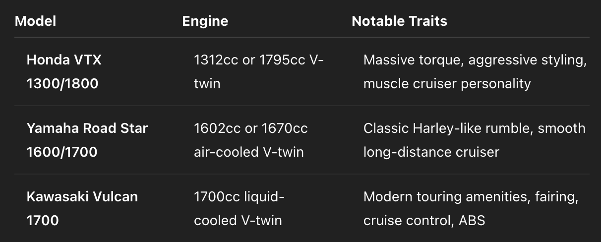 Yamaha Road Star: Good comfort and stability. Air-cooled simplicity but lacks ABS unless customized.