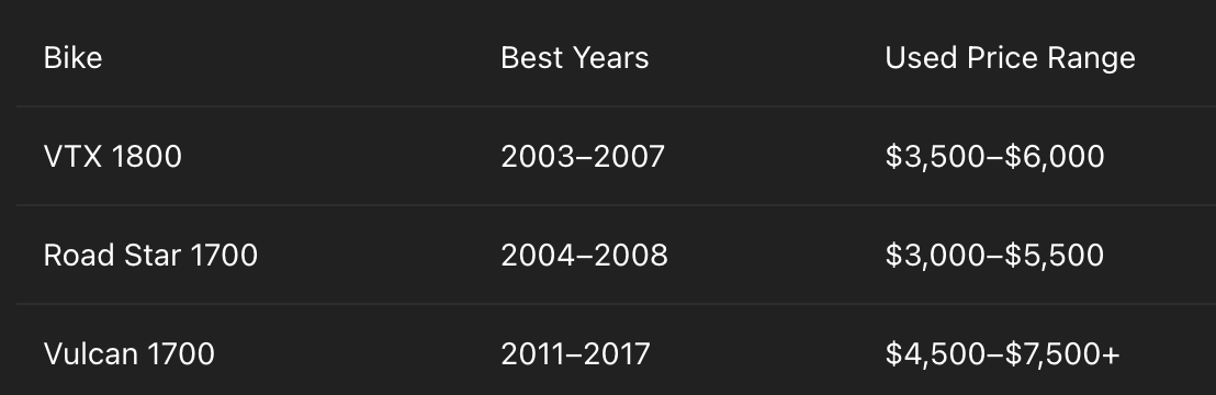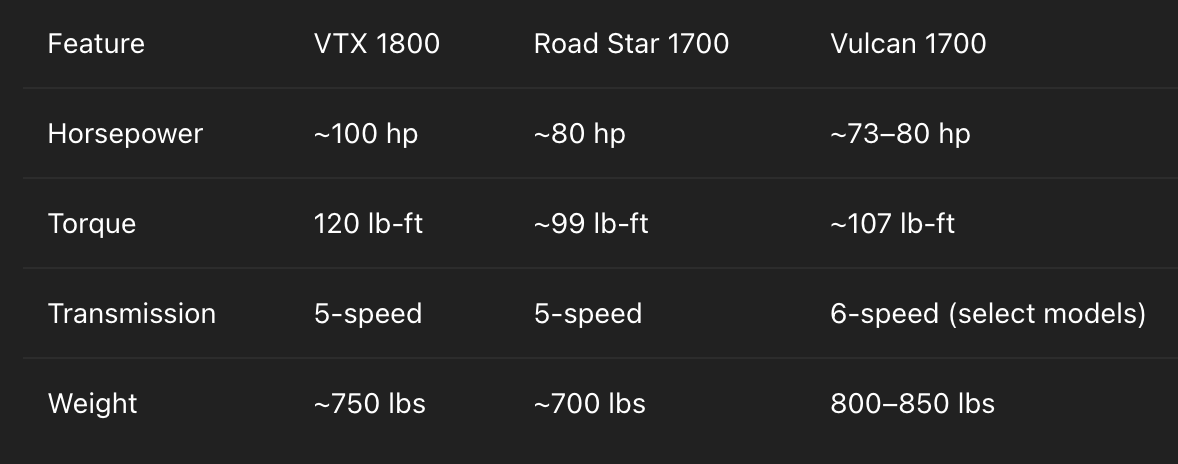 The VTX 1800 delivers raw power and massive torque. It's the performance king in this trio. However, if smoothness and long-haul comfort are your thing, the Vulcan 1700 is tough to beat.