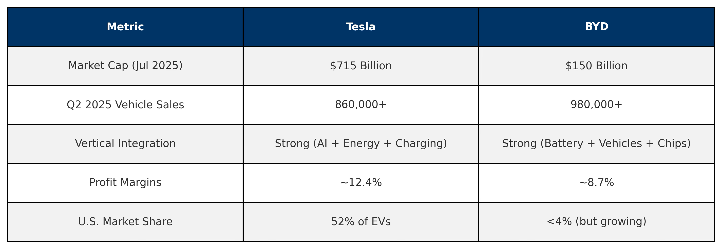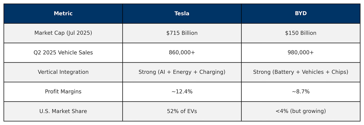 Tesla remains financially dominant, especially in the U.S., but BYD’s volume-driven model could make it more scalable long-term—especially in emerging markets.