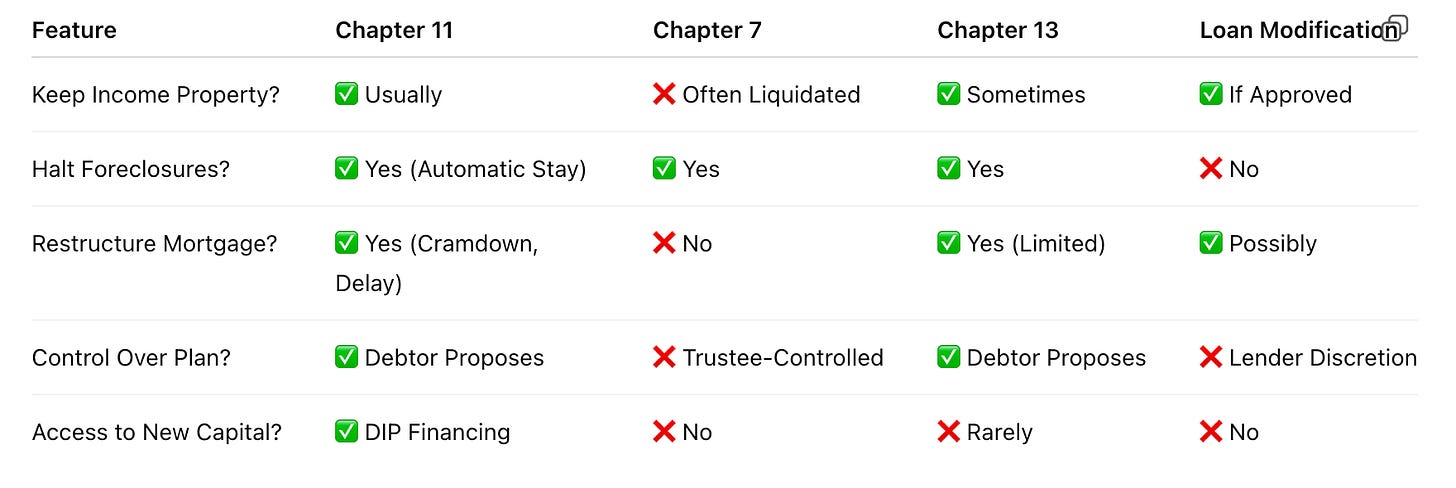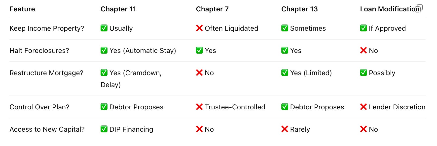 For real estate investors, Chapter 11 provides a way to keep income-producing properties, renegotiate mortgage terms, and avoid fire sales of assets.